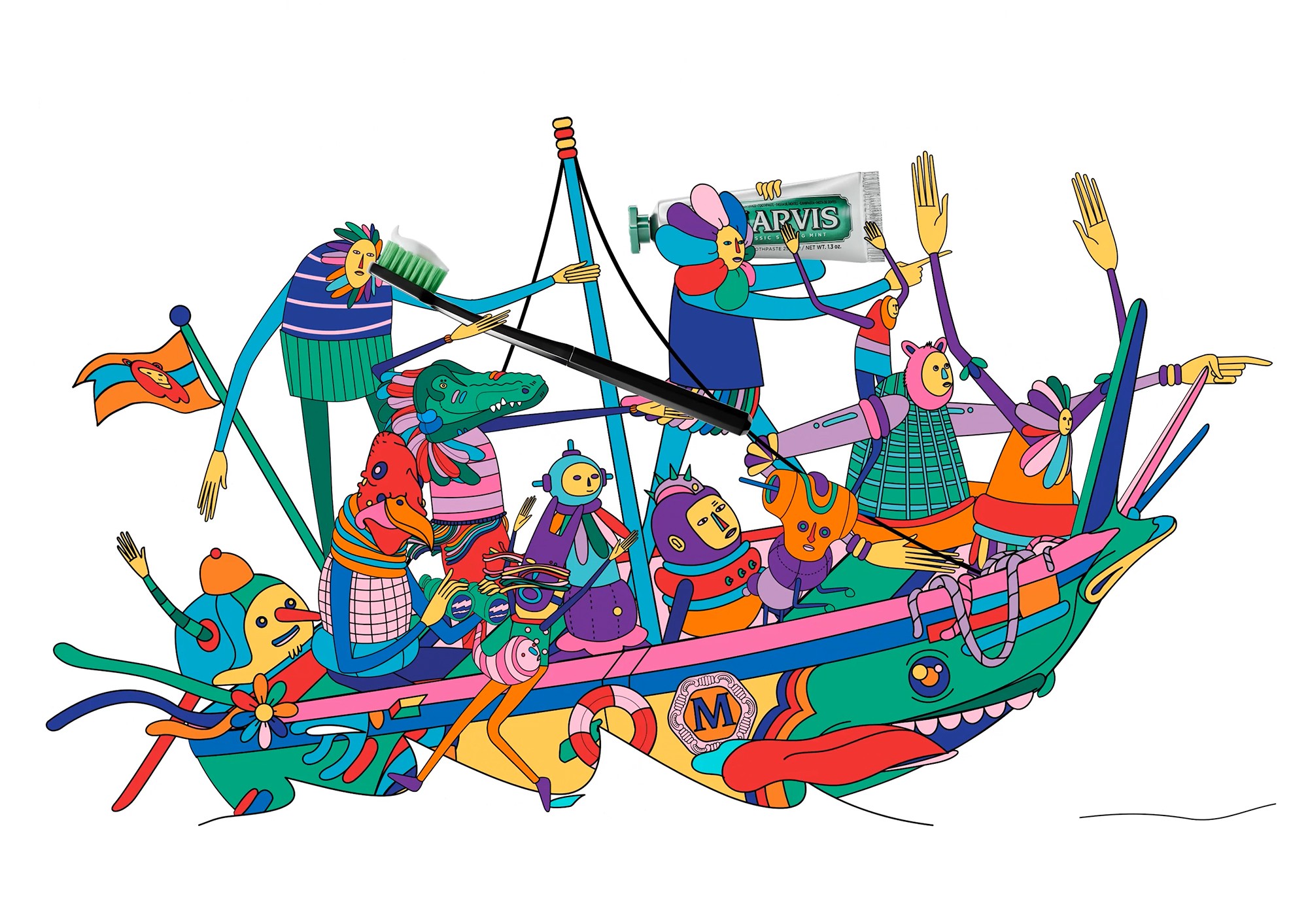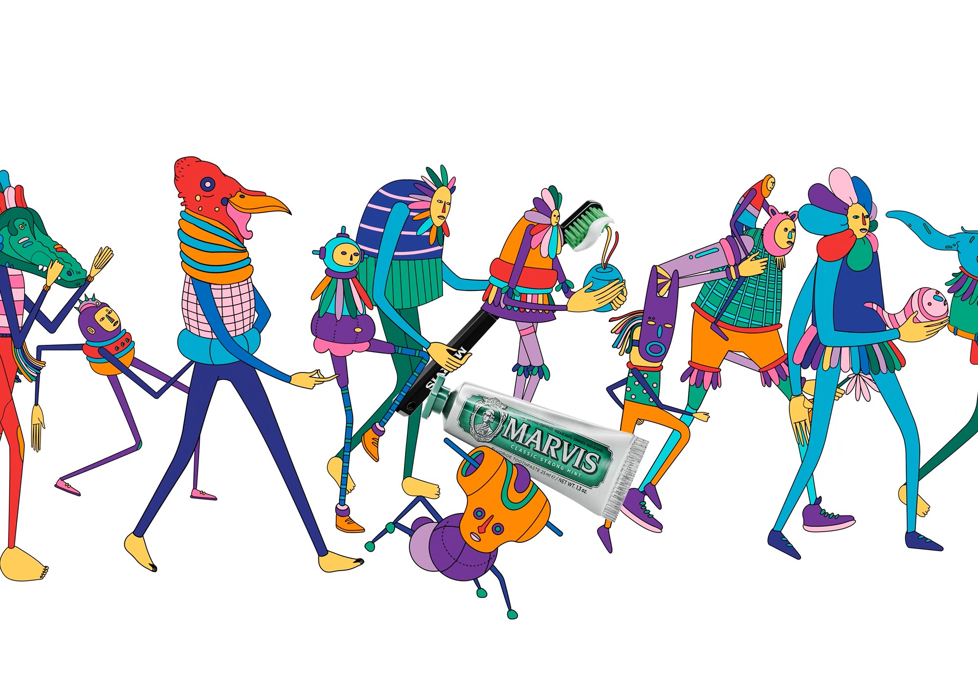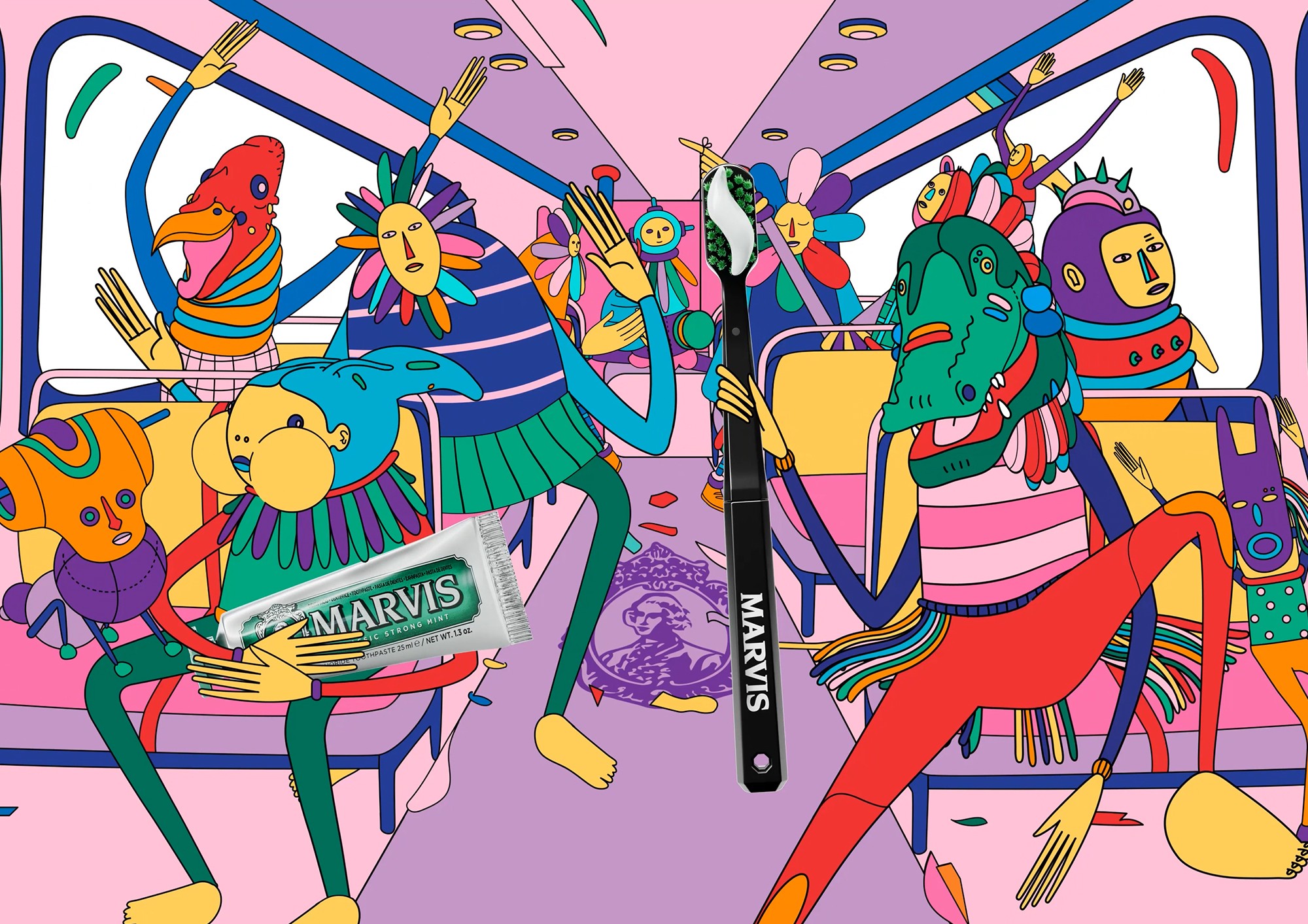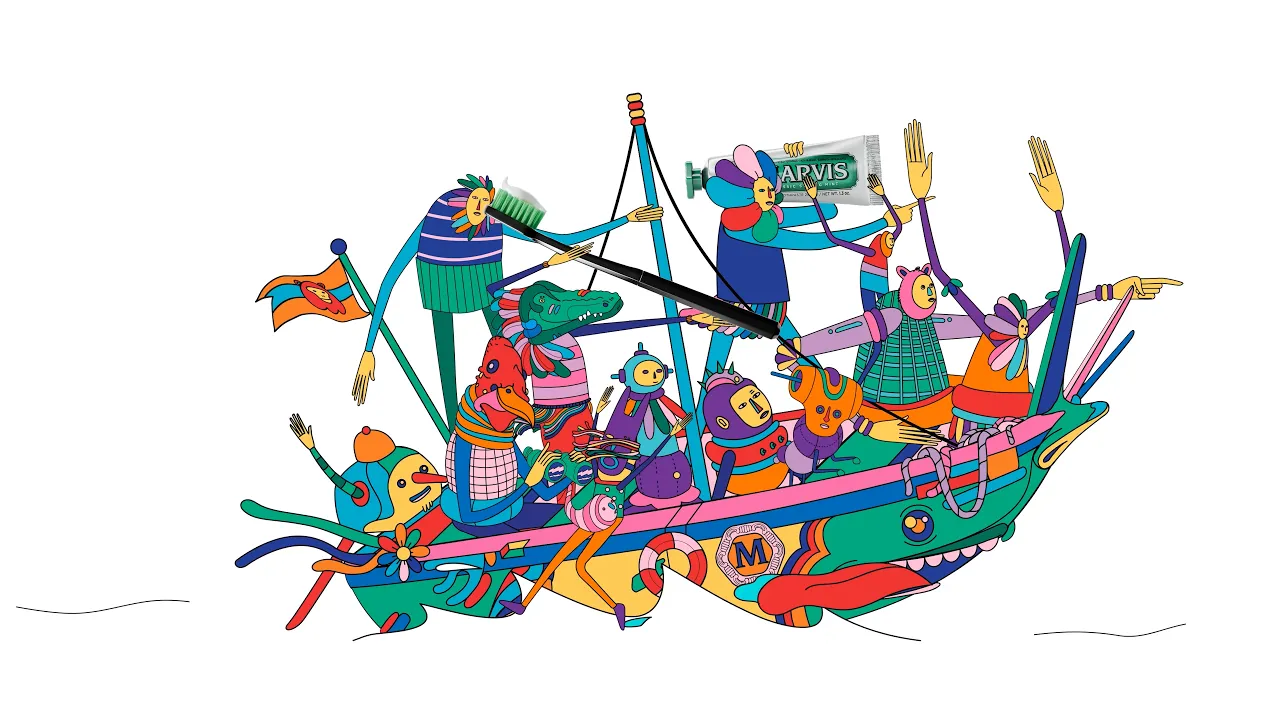 For the launch of the new Marvis Travel Set, we created an animated video in collaboration with artist Gabriel da Silva. The story follows a series of characters in motion, all carrying the same toothbrush and toothpaste, as they embark on a sequence of small journeys aboard vibrant, colorful vehicles. A dynamic and light flow that guides them, step by step, until they converge inside the set: The core and final destination of the narrative.